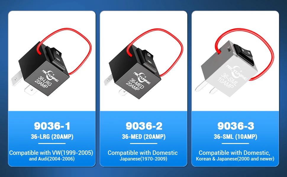 1. Wide Compatibility - 9038A relay bypass switch kit Compatible with Japanese, Korean, and German vehicles like GM, BMW, Audi, and Chrysler. Fits most fuel pumps, cooling fans, window motors, headlight switches, air conditioning compressors and other devices using automotive relays