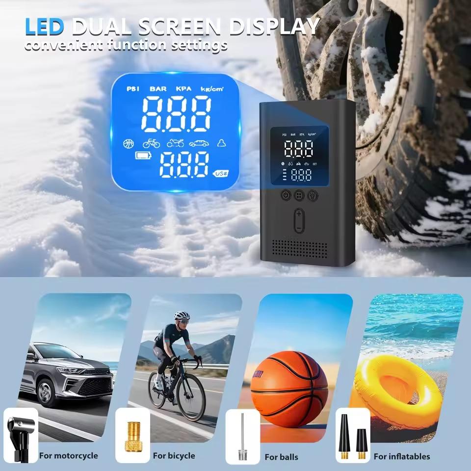 The package includes various tools: car charger cables, air nozzles, and a black carrying case. All designed for convenience and functionality.