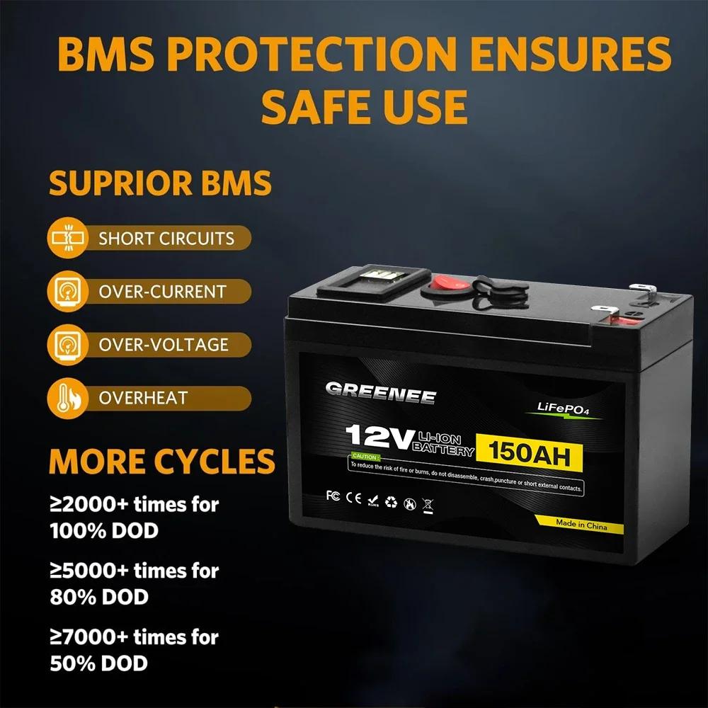 Superior Performance: Lithium iron phosphate battery has high energy density, Long cycle life, Good safety performance, No memory effect, etc. GREENEE LiFePO4 battery has built-in BMS protection to prevent overcharge, Over-discharge, Over-current and short circuit, and very low self-discharge rate. (Not motorcycle starter battery)